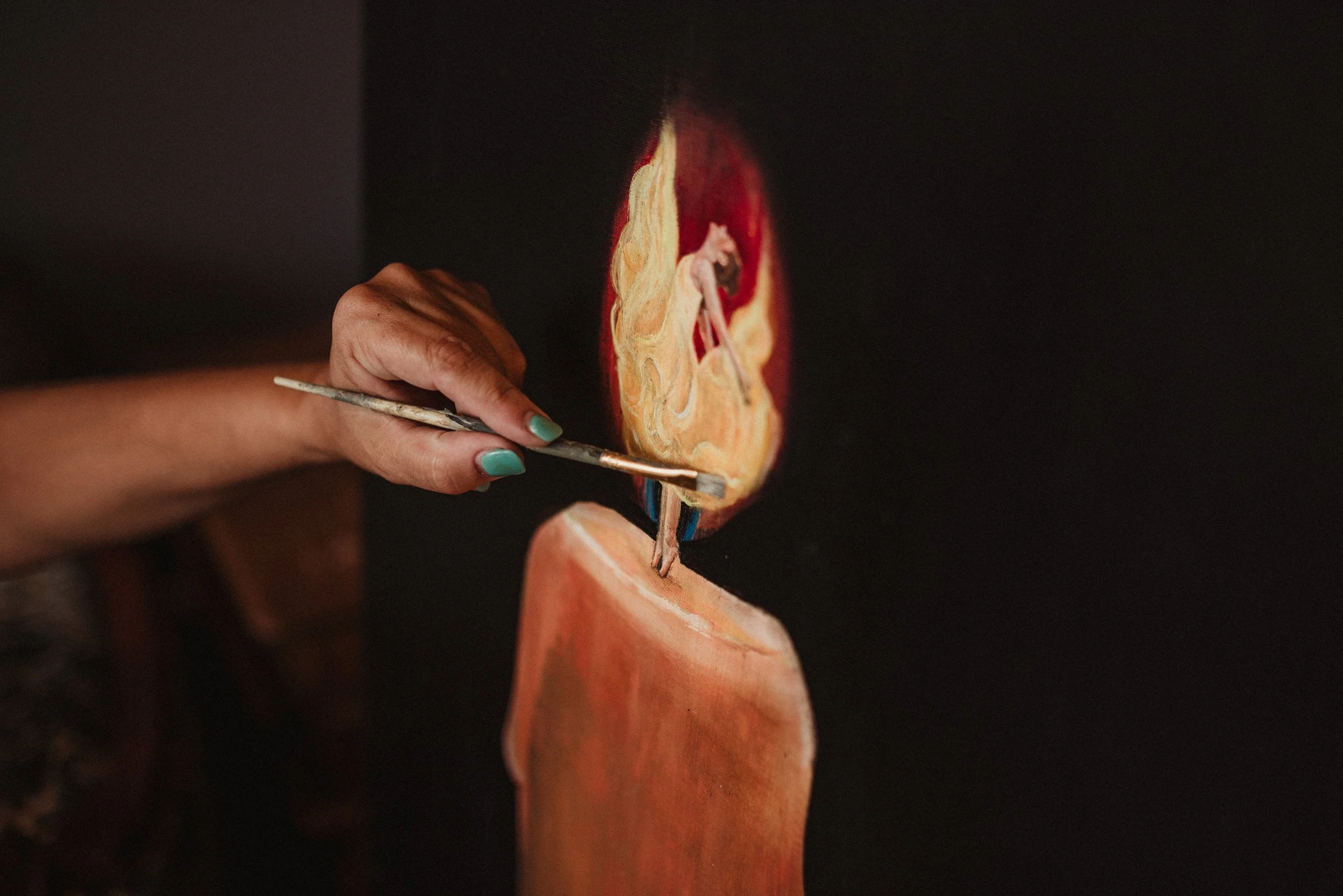 This painting, titled Alchemy of the Heart, is a 24×30-inch acrylic artwork on canvas by Bethany Coppock. It portrays a deeply emotive scene where a woman plays the violin amidst a vibrant tapestry of blooming flowers. Her serene expression and the delicate light illuminating her create an atmosphere of harmony and introspection. A white dove perches gently on her shoulder, symbolizing peace and purity.