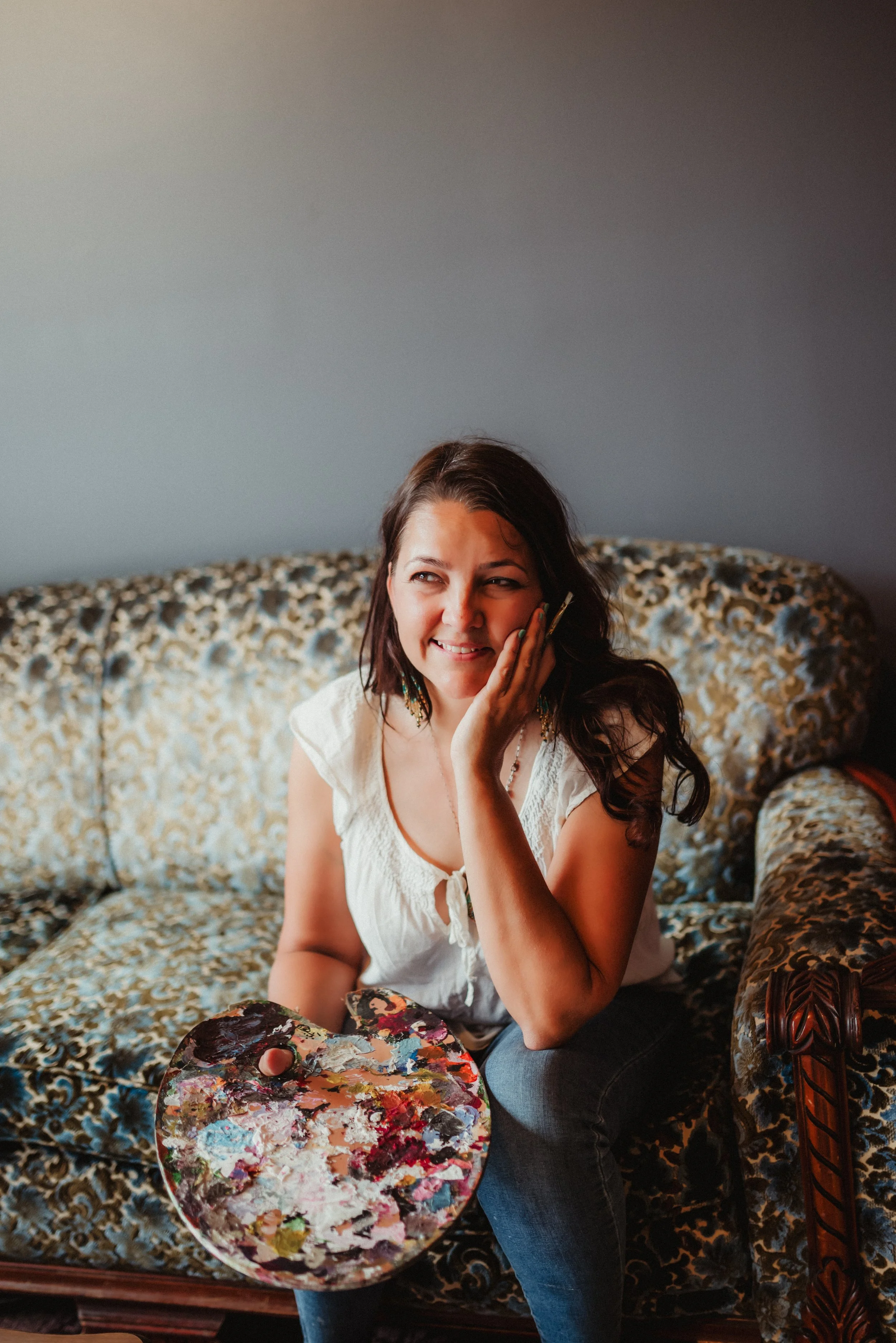 This painting, titled Alchemy of the Heart, is a 16x20-inch acrylic artwork on canvas by Bethany Coppock. The artwork features a serene woman with flowing dark hair, holding a vibrant red anatomical heart that blooms with an assortment of flowers. The intricate floral details symbolize life, growth, and emotional connection. A monarch butterfly perched delicately on the heart adds a powerful element of transformation and rebirth.